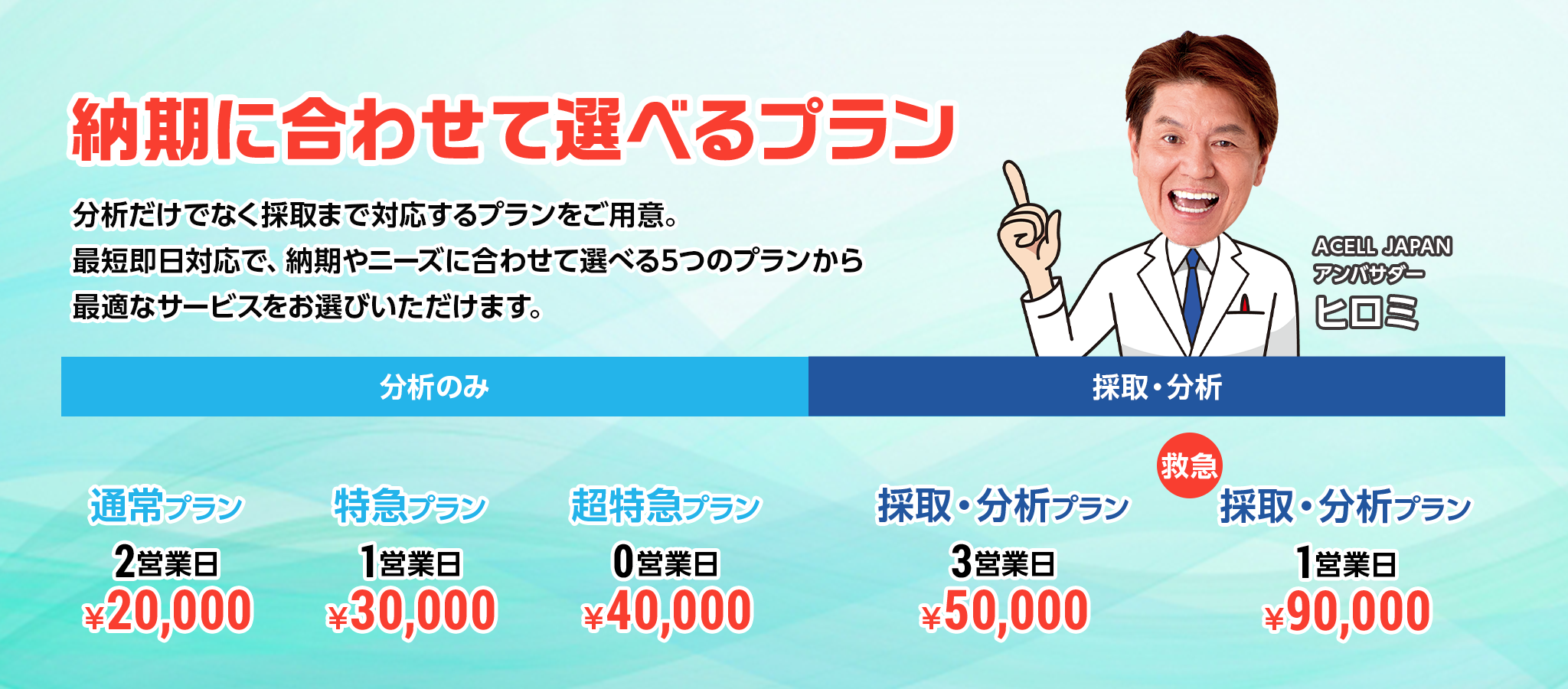 - ※採取・分析プランでは日程によって、お得なキャンペーンもご用意しておりますので、お問合せ時にご相談ください。