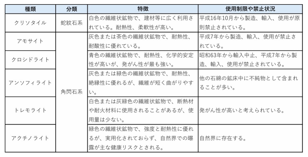 個々のアスベストの詳しい特徴は以下の記事を参照してください。よろしくお願いいたします。
