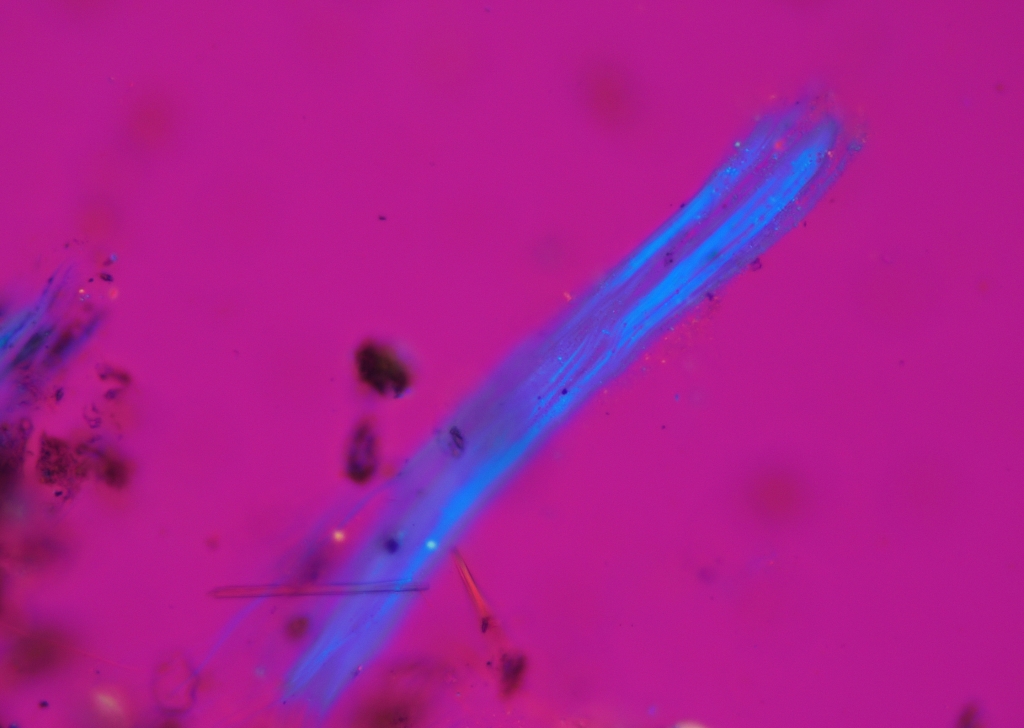 非常に紛らわしい混入物です。よく観察すると節の存在が確認できる、押しても繊維束がほどけてこないなどといったとからクリソタイルではないことを確認できます。