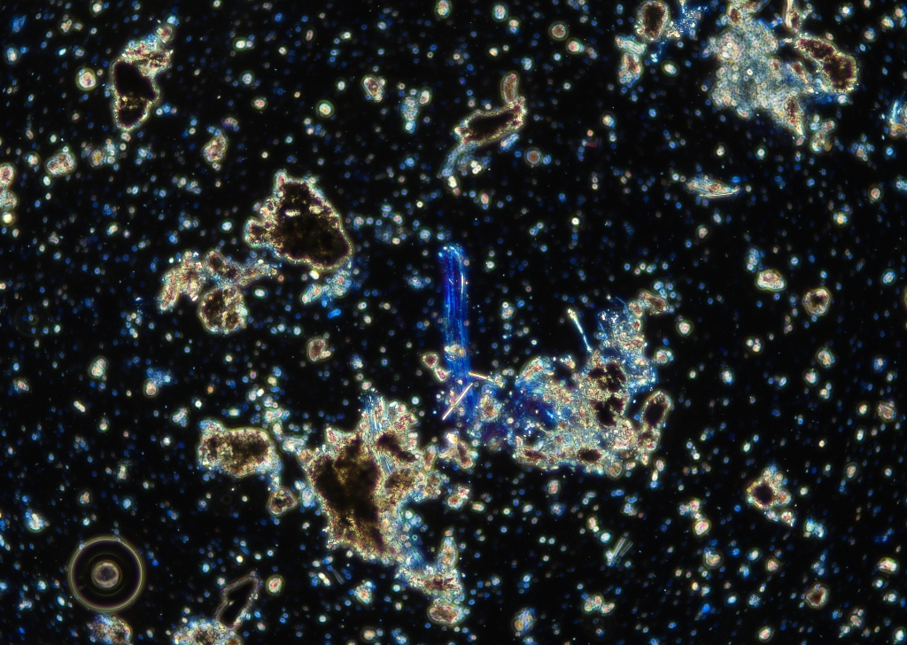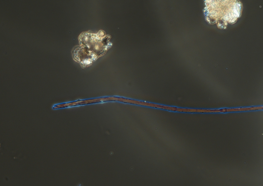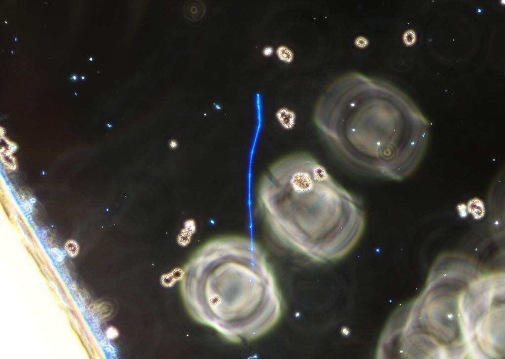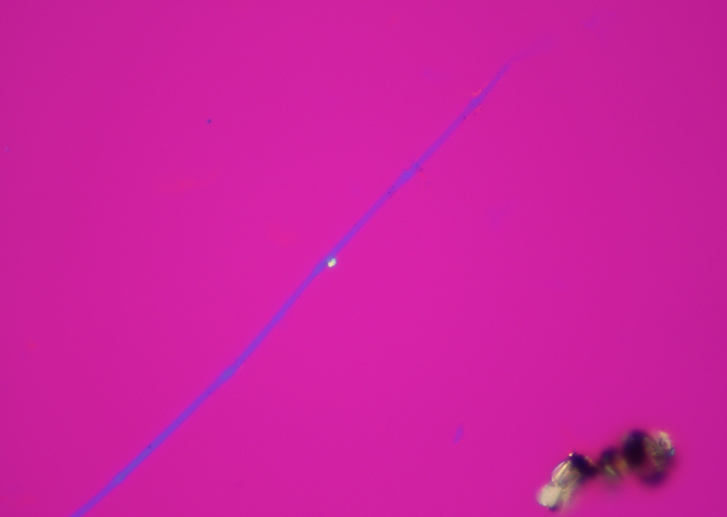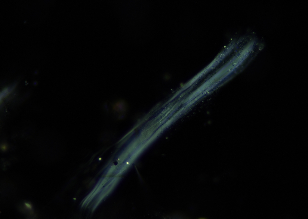 実体顕微鏡で検体を見たところ、アスベストのような繊維が見えたため、今回は前処理せずそのまま顕微鏡観察しました。