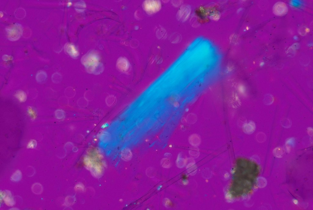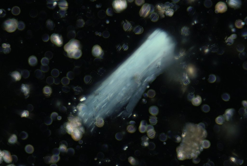 ロックウール建材の中にクリソタイルが含有している時、クリソタイルの形状は繊維状に見えづらい時が多いので分析には慣れが必要です。具体的にいいますと密集している形状のクリソタイルが多いです。判断するためには繊維の先っぽをみます。よく見るとばらけて繊維っぽく見えます。さらに今回写真には載せていませんが分散染色等で色の変化を確認したのちクリソタイルと判断いたしました。