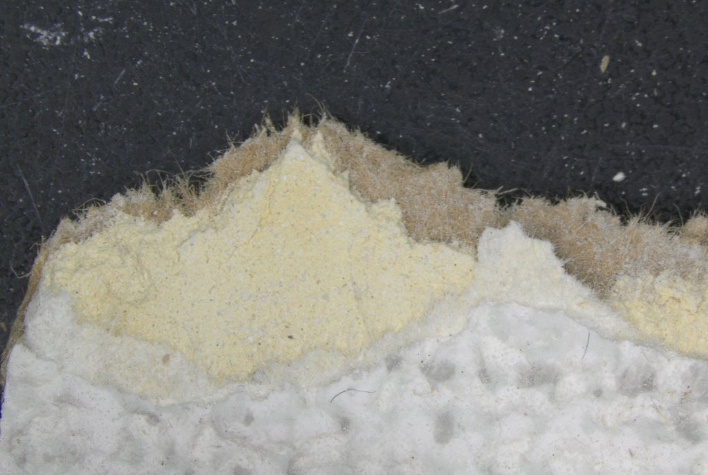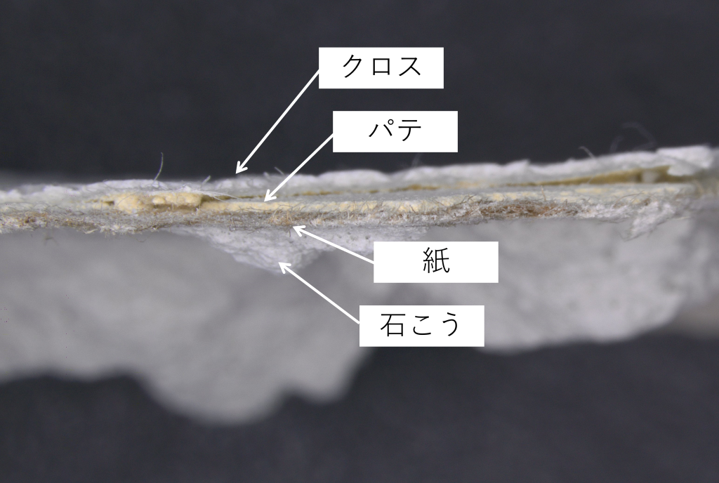 石膏ボードは安価で使用しやすいため建物の内装によく使われています。今回の検体は上からクロス、パテ、石膏ボード(紙、石膏)の構成でした。