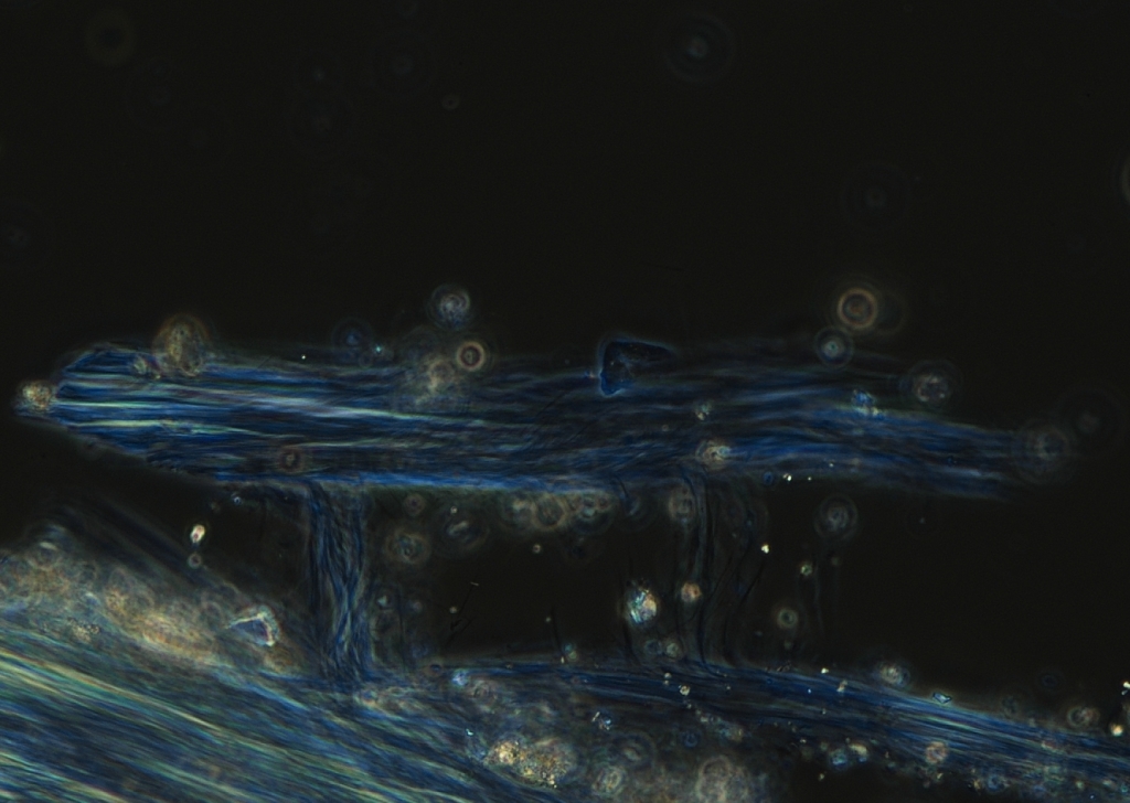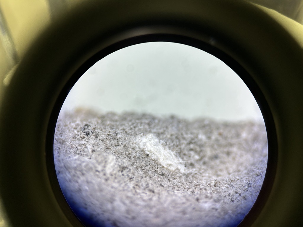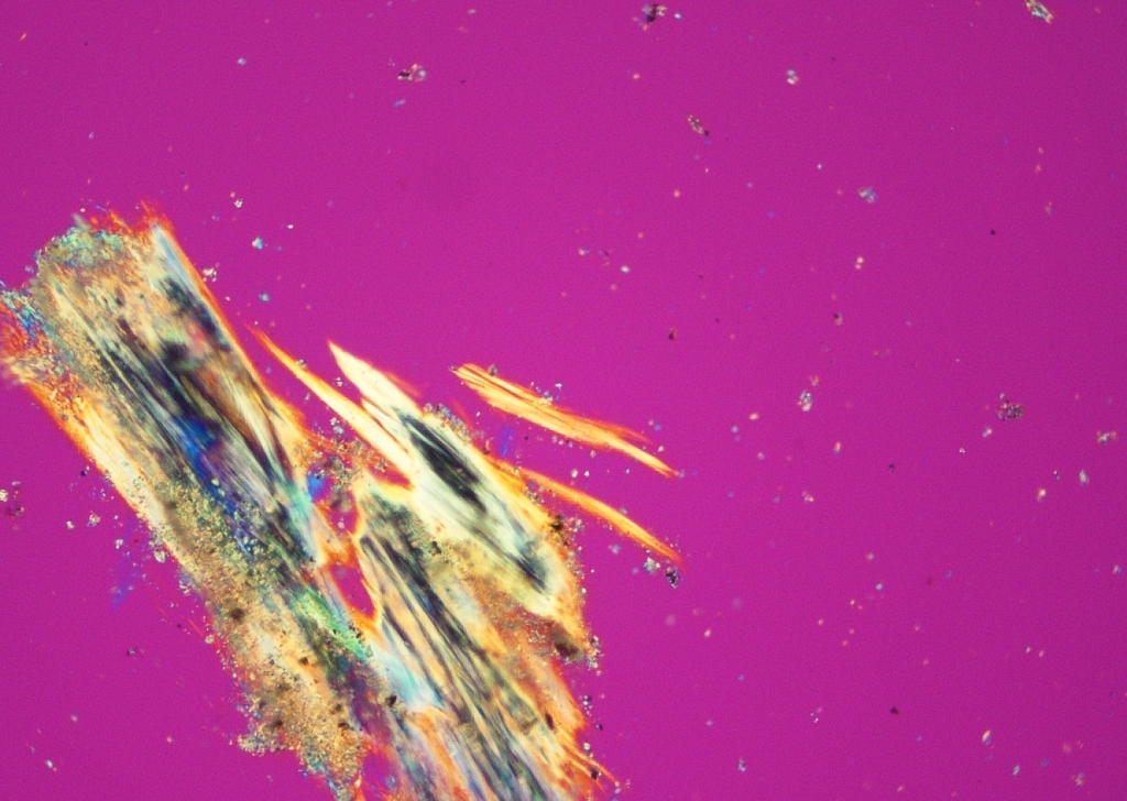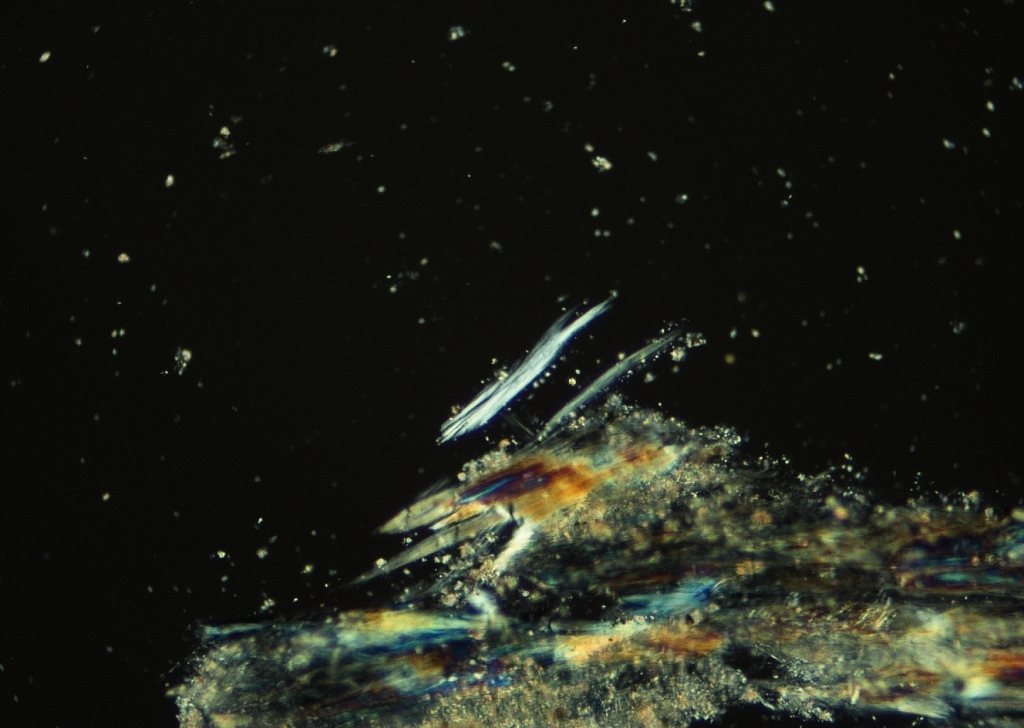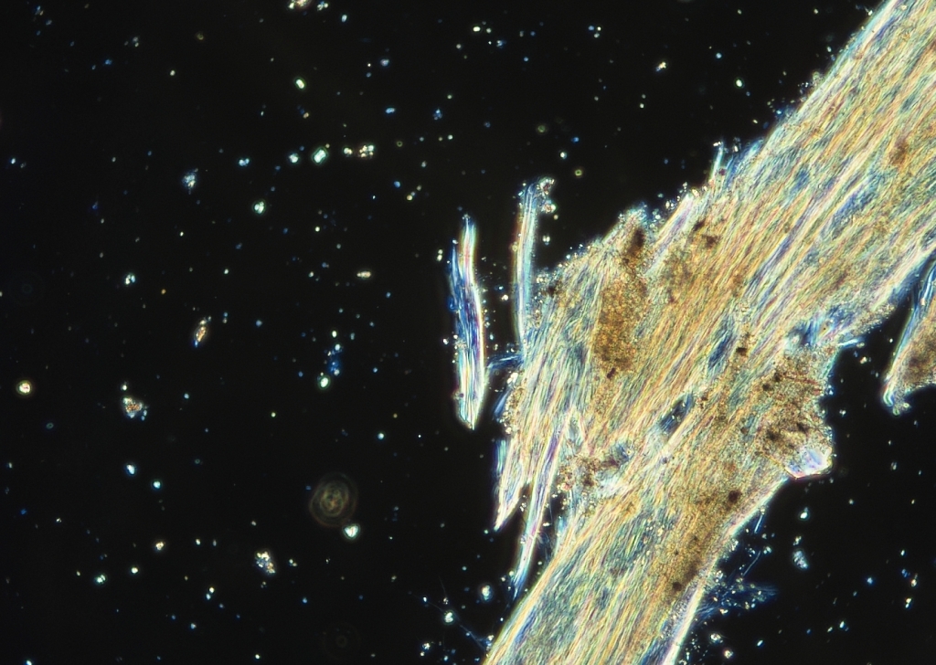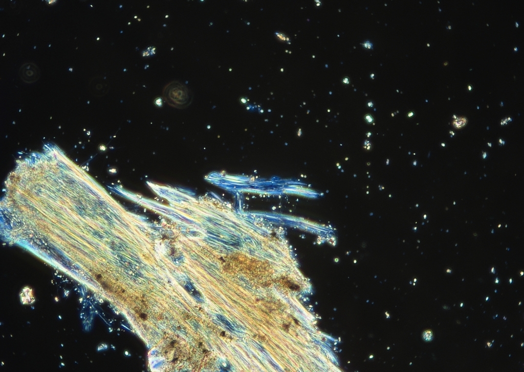 建材から繊維を抜き取り、細心の注意を払って作成したプレパラートを偏光顕微鏡のもとへと誘います。