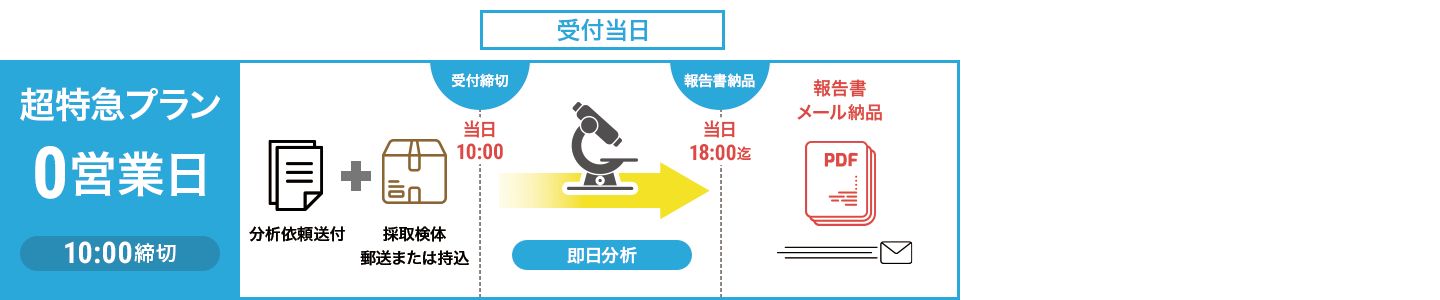 報告書の納品日数は受付日からの起算になります。 - ※超特急プランをご希望の方は午前10時までに分析センターに到着した検体に関して