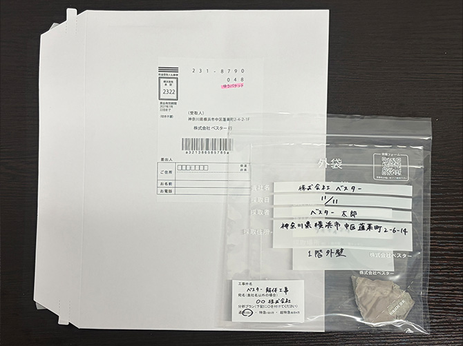 検体の内袋に試料番号、建材名、採取場所を、外袋には貴社名、採取日、採取者、採取住所を記入してください。