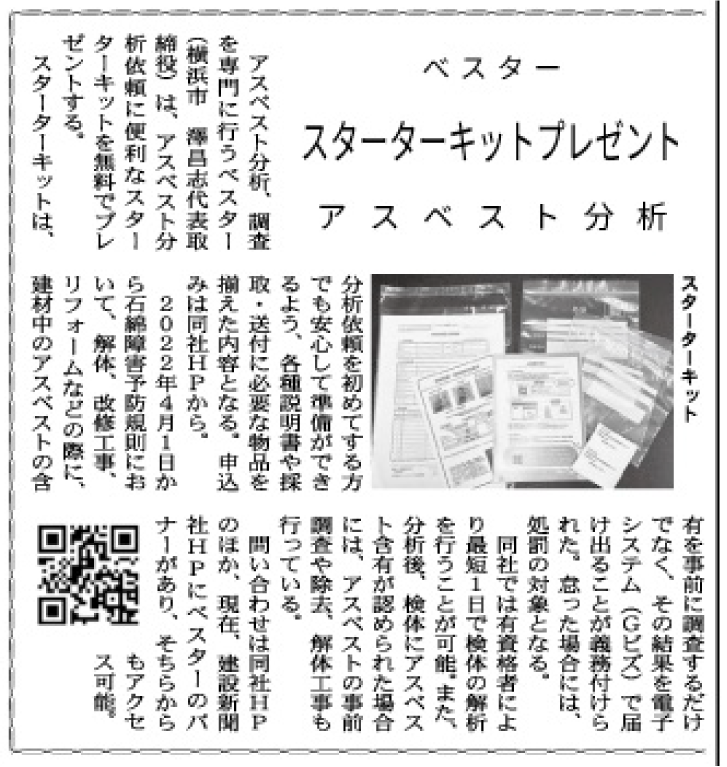 ベスターの『スターターキット』が建設新聞に紹介されました